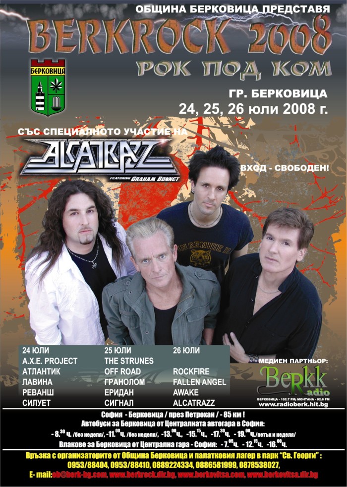 Вярвам, че всички фенове на тежката музика са се накефили много на снощния концерт на Metallica, но се оказа, че има и още едно важно музикално събитие, което някак си е останало в сянка и много малко медии информират за него – Берковският рок фестивал – Беркрок 2008. Той е започнал още в четвъртък и днес е последният му ден, който ще бъде закрит с концерт на големия рок глас – Graham Bonnet и неговата група Alcatrazz. (Аз самият научих едва днес)