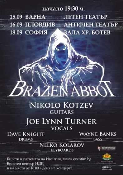 Групата Brazen Abbot идва за три концерта в България – във Варна на 15 септември в Летния театър, в Пловдив на 16 септември в Античния театър и в София на 18 септември в зала „Христо Ботев“. Вокалист (както в повечето случаи на концерти) е Joe Lynn Turner, а сетлистът включва както най-добрите парчета на групата, така и класически хитове от репертоара на Rainbow и Deep Purple – истинска наслада за феновете на хард-рока!