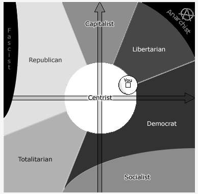 Покрай миналия път, когато Бачийски беше писал за политическия тест, и аз го изкарах. Оказах се демократ с леки забежки на центризъм. Сега си направих труда пак да се пробвам на него – съвсем с малко съм мръднал още повече накъм центъра.