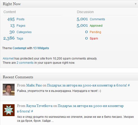 Както мнозина може вече да са забелязали, опитвам се да създам традиция да раздавам награда за всеки хиляден коментар в този блог и за щастие се получава. Този път печелившата е Райна Цветкова, а аз дори уцелих точния момент, в който се появи нейният коментар и успях да го регистрирам на снимка:
